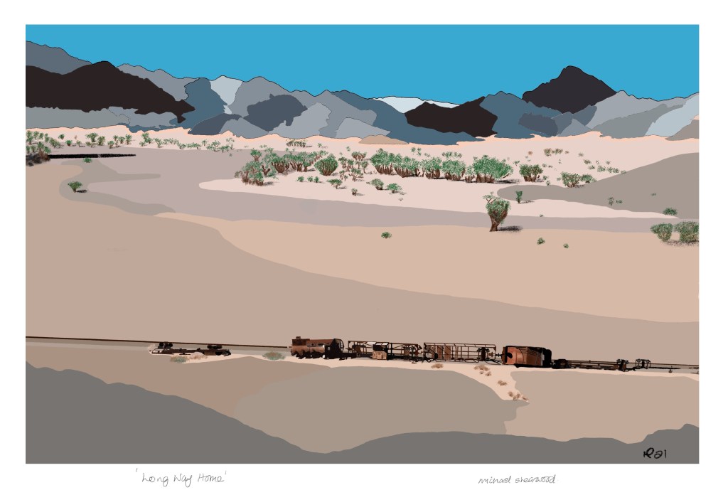 When I travelled along that disused line years ago, many of the old carriages and engines still lay where they had fallen — skeletal reminders of another age. One of them, half-buried and leaning on its side, became the subject of my sketch, Long Way Home.